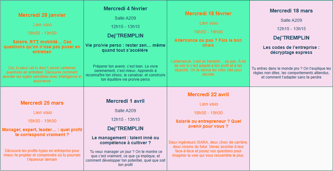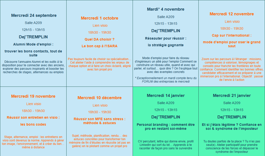 Voici l'agenda 2025-2026 des ateliers proposés aux élèves adhérents à l'association Alumni Isara et organisés dans le cadre de Tremplin, le programme qui va les propulser vers leur avenir. Ces ateliers sont animés par des ingénieurs ISARA diplômés qui viennent partager leurs expériences et leurs conseils.